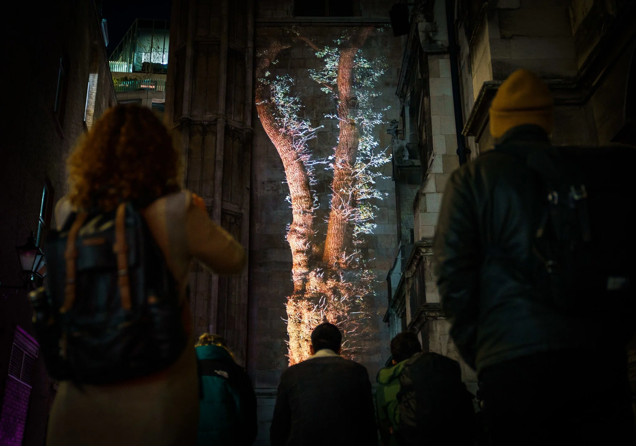 City of Trees is a public installation and video series exploring Epping Forest’s ancient, symbiotic relationship with humans and London. Life-size video portraits of Oak, Beech and Hornbeam pollards from Epping were projected onto St Mary Aldermary Church in the City accompanied by an immersive soundscape by James Bulley and original musical score for each by NYX and Laura Misch – recorded in Epping Forest – and benches formed from two halves of a recently felled oak from Epping. The accompanying video series, exploring the ecological and social history and future of the forest can be viewed here.